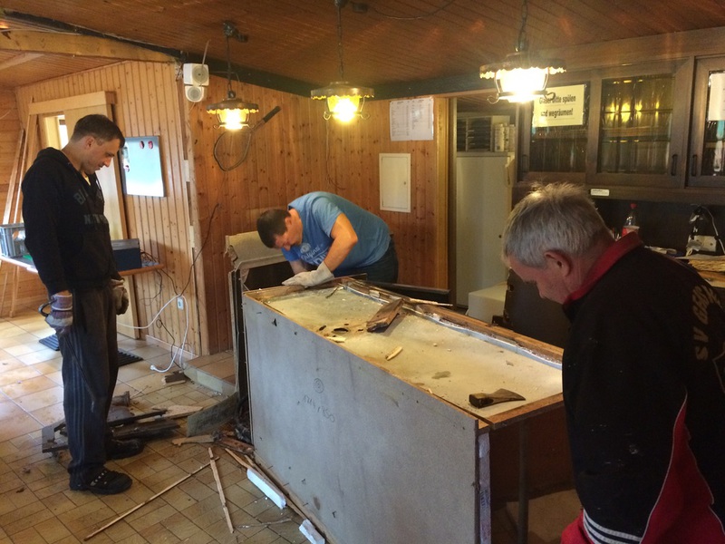 Das Abladen der Theke war für die stärken Männer keine große Herausforderung, binnen weniger Minuten stand das neue „Teil“ an seinem Bestimmungsort. Anschließend wurden schon wieder gewerkelt, Wandverkleidungen wurden entfernt, Kabel neu gezogen und Leon und Laurenz kümmerten sich fachmännisch um die Deckenkonstruktion in der Damen-Toilette. Abgerundet wurde der erfolgreiche Arbeitstag mit selbstgemachten schwedischen-Birnenschiffchen von unserer Schriftführerin Karin Uhl. In den nächsten Arbeitseinsätzen bekommt die Theke dann ihr neues Gesicht. Fleißige Helfer können sich auf unserer Website über die nächste Einsätze informieren.
