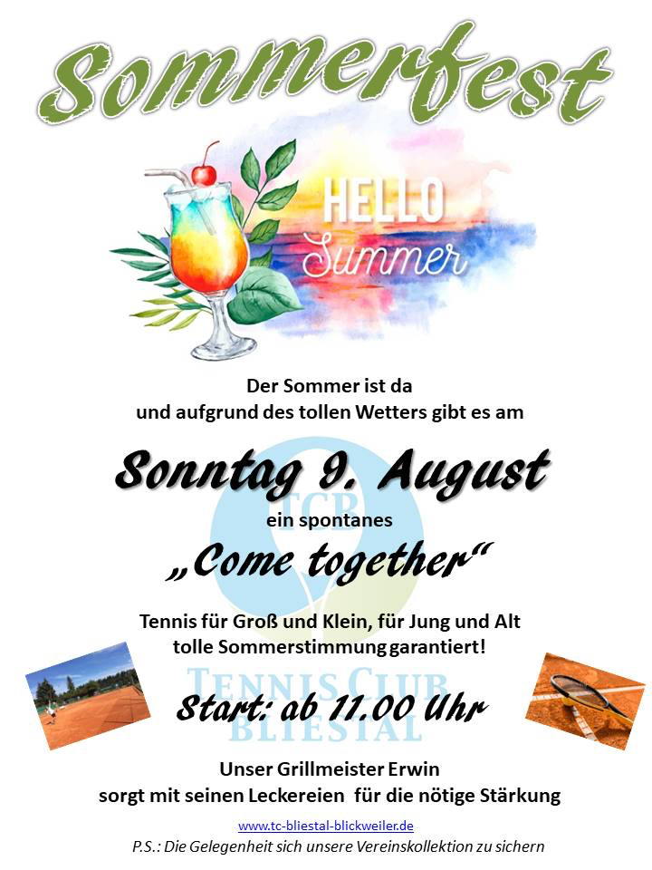 Am vergangenen Sonntag, den 9.8. fand das erste Sommerfest beim TC Blickweiler statt. Hochsommerliche Temperaturen haben zahlreiche Mitglieder und Gäste angelockt. Trotz der sehr kurzfristigen Ansetzung, hatten sich im Laufe des Tages über 30 Gäste auf unserer Tennisanlage eingefunden. Die Spielpaarungen wurden kunterbunt zusammengemischt und es so entstanden teils witzige, als auch kämpferische und spannende Begegnungen. Auch unser Grillmeister Erwin Becker freute sich, endlicher wieder mal seine legendäre Currywurst zu präsentieren.